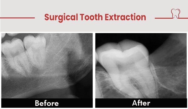 Our dentist will make a mark on the part of the gum tissue during the surgical extraction. This helps in getting the path to bone tissue and the underlying tooth. For better visibility of the tooth, our dentist may trim away the bone tissue. Later on, the tooth will be sliced into pieces in order to remove it easily.